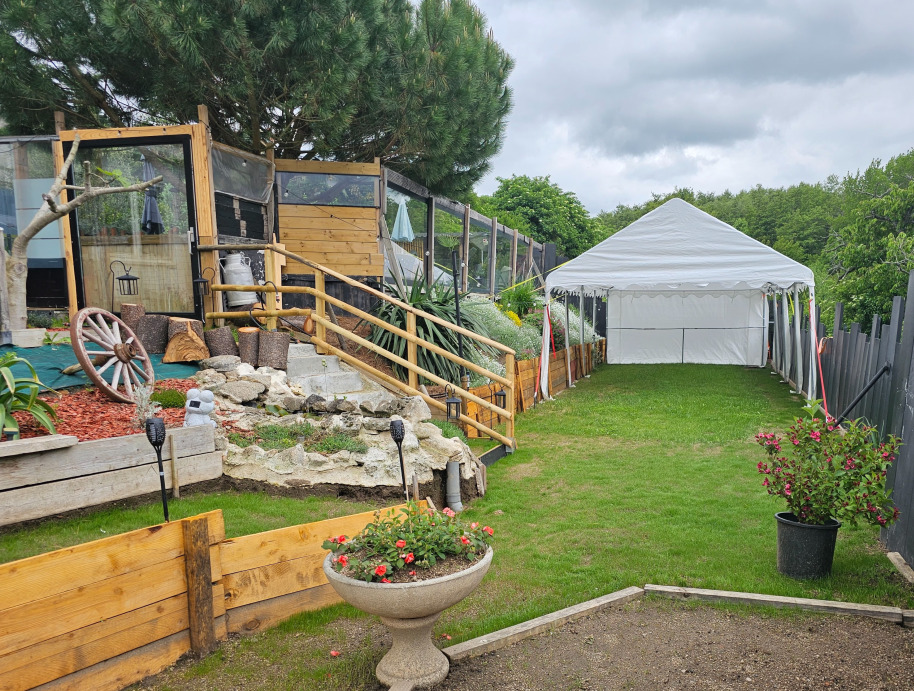 Pour un anniversaire, un gouter, un mariage, etc. Nous avons un espace extérieur avec une tente de réception pouvant accueillir 60/70 pers.